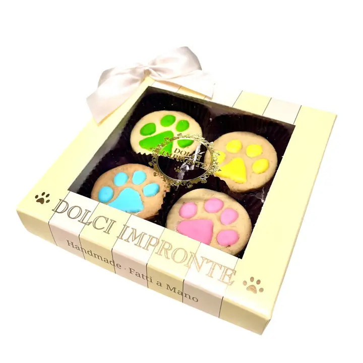 Verpakt in een waardevolle recyclebare kartonnen doos van voedingskwaliteit, 150x143x30H mm, versierd met een lint, zijn de Dolci Imprints 4 poten een perfect cadeau voor onze viervoetige vrienden. Elk koekje is gemaakt van zandkoek, handgemaakt en individueel gedecoreerd door onze meesterbakkers.